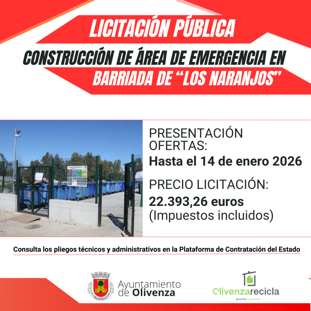 El Ayuntamiento de Olivenza ha abierto el proceso de licitación para la construcción de una nueva área de emergencia para la recogida selectiva de residuos municipales en la barriada de Los Naranjos, una actuación destinada a mejorar el funcionamiento del sistema de recogida puerta a puerta (PaP) y a facilitar una alternativa accesible a la…