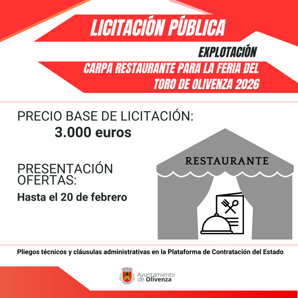 El Ayuntamiento de Olivenza ha abierto el procedimiento de licitación para la explotación de la carpa municipal destinada a bar-cafetería/restaurante durante la XXXV Feria del Toro de Olivenza 2026, que se celebrará del 6 al 8 de marzo en el recinto ferial de la localidad. La carpa, de aproximadamente 300 metros cuadrados, estará ubicada junto…