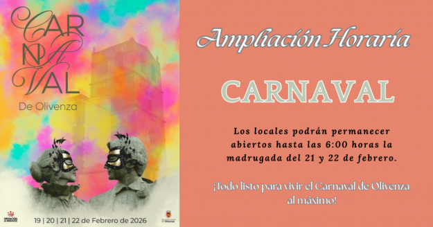 🎭🕺 Olivenza amplía horarios para su Carnaval 2026 La Secretaría General de Interior, Emergencias y Protección Civil ha autorizado la ampliación del horario de cierre de todos los establecimientos hosteleros de Olivenza con motivo de la celebración del Carnaval 2026 . 📅 Fechas: Madrugada del 20 al 21 de febrero Madrugada del 21 al 22…