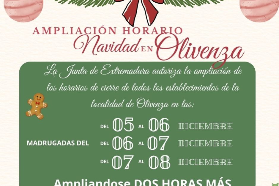 La Junta de Extremadura a través de la Secretaría General de Interior, emergencias y protección civil, emite la resolución por la que se autoriza la ampliación de horarios de cierre de todos los establecimientos de la localidad de Olivenza en las madrugadas del: