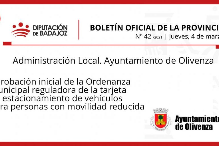 El Pleno del Ayuntamiento de Olivenza, aprobó inicialmente, en sesión ordinaria celebrado el pasado miércoles 24 de febrero de 2021, la Ordenanza municipal reguladora de la tarjeta de estacionamiento de vehículos para personas con movilidad reducida.