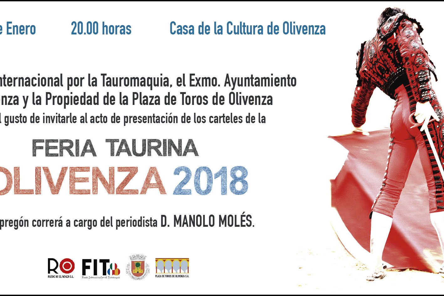 Grandes nombres del mundo de la tauromaquia serán un año más los protagonistas de los festejos taurinos programados por la empresa Ruedo de Olivenza, perteneciente a la Fusión Internacional por la Tauromaquia, que conforman el cartel de la XXVIII Feria del Toro de Olivenza, cartel que el próximo miércoles 31 de enero será presentado por otro de los nombres de referencia del sector; el periodista Manuel Molés.