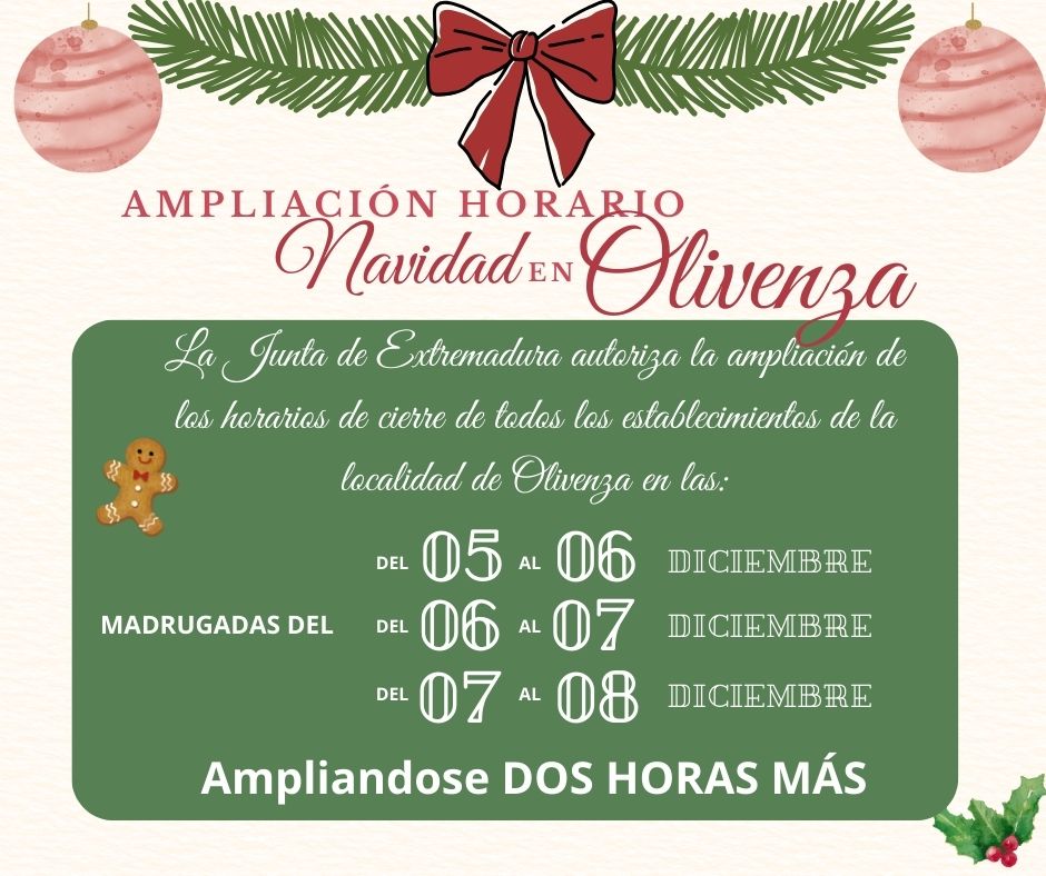 AMPLIACIÓN DEL HORARIO EN LOS ESTABLECIMIENTOS DE OLIVENZA CON MOTIVO DEL PUENTE DE DICIEMBRE